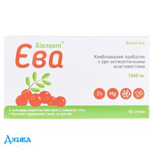 Пробіотик є фізіологічним для людини продуктом. Біолакт Єва - полікомпонентний пробіотик четвертого покоління, який містить лактобактерії, біфідобактерії, ентерококи та пребіотичні культури, які здатні досягати кишківника та інтимної зони і чинити антагоністичний вплив на патогенні мікроорганізми та дріжжоподібні грибки. Лактобактерії продукують молочну кислоту, пригнічують ріст хвороботворних мікроорганізмів та поступово витісняють їх, працюючи як природний конкурент. Ентерококи та біфідобактерії беруть участь у процесах ферментативного розщеплення жирів, білків та складних вуглеводів, у процесах синтезу та всмоктування вітамінів. Наявність у Біолакті Єва різних корисних штамів пробіотичних мікроорганізмів дозволяє позитивно впливати на загальний стан і травні функції всього кишківника, а також має детоксикаційні властивості. Біолакт Єва є пробіотичною підтримкою при лікуванні гінекологічних та урологічних хвороб шляхом:
