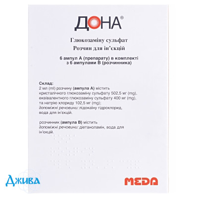 діюча речовина: 2 мл розчину (ампула А) містить кристалічного глюкозаміну сульфату 502,5 мг, еквівалентного глюкозаміну сульфату 400 мг, та натрію хлориду 102,5 мг;