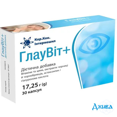 «ГлауВіт+» - це дієтична добавка з вітамінами та цинком, екстрактом чорниці, астаксантином, гіалуроновою кислотою та екстрактом чорнобривців. Дієтична добавка може бути рекомендована як доповнення до звичайного раціону харчування - джерело вітамінів A, Е групи B (B1, B2, B6) та цинку.