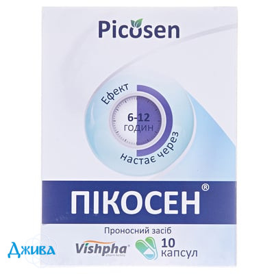 ПІКОСЕН® - комбінований контактний проносний засіб. Натрію пікосульфат є проносним засобом місцевої дії триарилметанової групи, який після бактеріального розщеплення у товстій кишці стимулює її слизову оболонку, прискорюючи перистальтику, сприяє кумуляції води та електролітів у просвіті товстої кишки. Результатом цього є стимуляція дефекації, зменшення часу транзиту і пом'якшення калу.