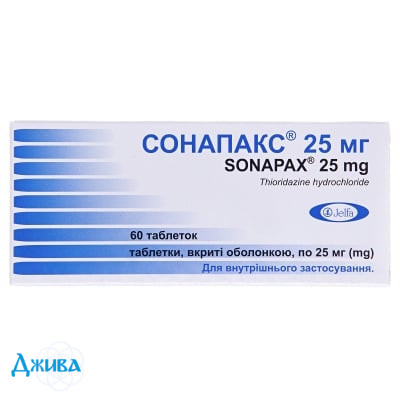 Таблетки Сонапакс ® 25 мг - круглі двоопуклі таблетки, вкриті оболонкою, світло-жовтого кольору, однорідні за забарвленням. На зламі білі.